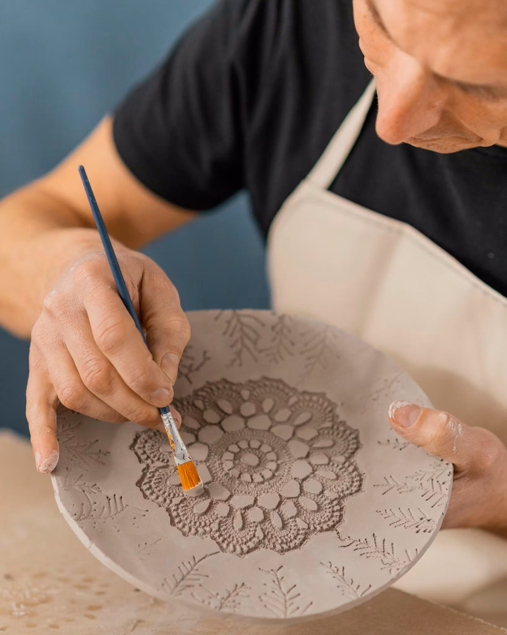 Målning/dekorering av skröjbränd keramik med underglasyr-färger.